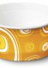 La grafica vintage arancione con decorazioni geometriche sui toni del bianco, arancio acceso e sfumato può essere usata da sola o abbinata alle coppette per gelato con la stessa grafica ma di formati e colori diversi in modo da creare un vivace assortimento di coppette per gelato, piacevole da tenere esposto nel proprio locale e che facilita il servizio permettendo con un colpo d’occhio di riconoscere le misure a seconda del colore.